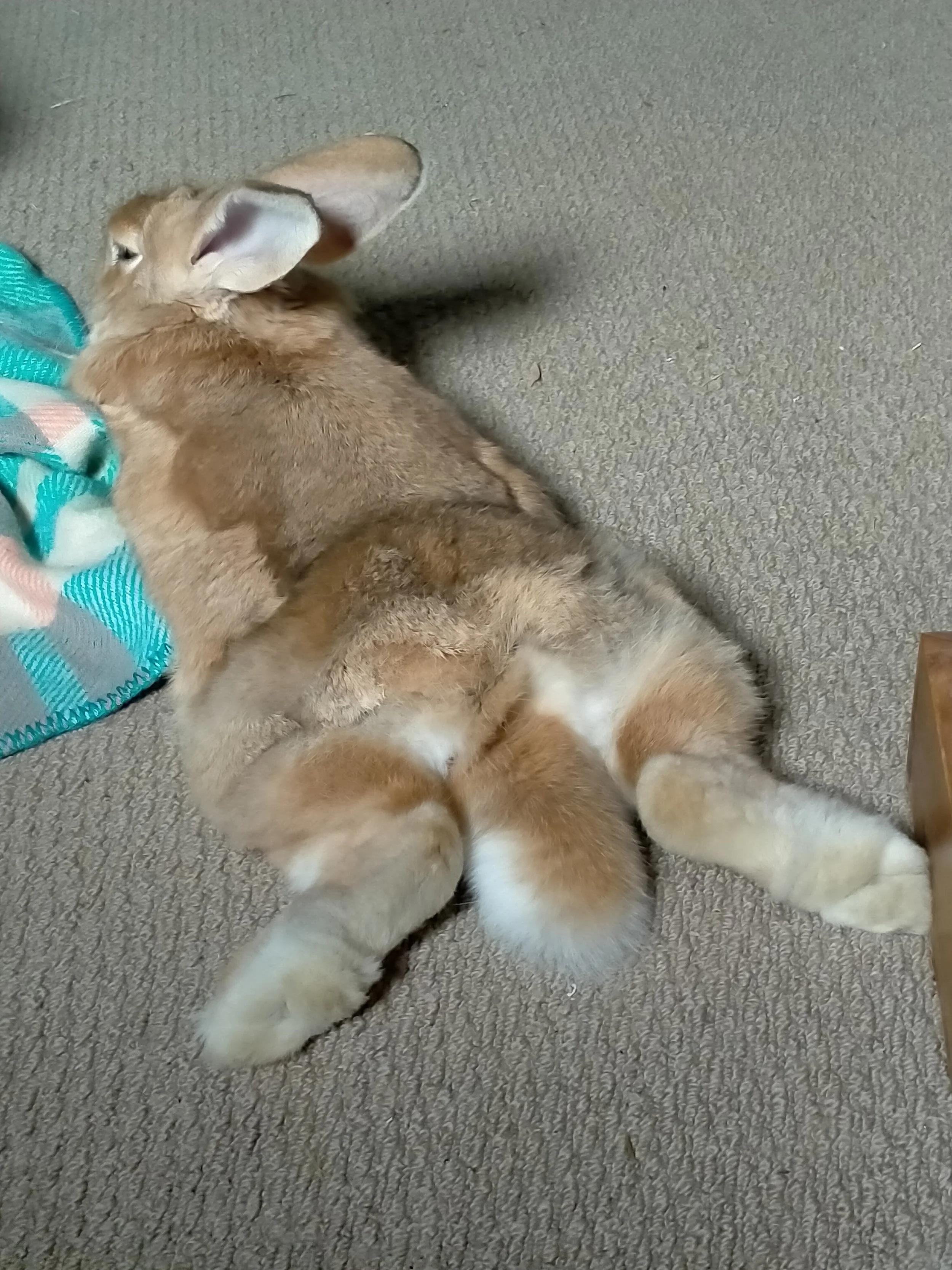 Dorothy Fluffy is due for a vaccination and is desexed. She is between 5-6 years old. She is a big soft white fluffball. I thought she was a cat when I first saw her. She likes a good massage and ear rub and will sit on your lap if you put her there for a good movie. While her husbunny is well toilet trained, Dorothy doesn’t always hit the litter box, as she learned later in life. We adopted her when she was 1-2 years old as “Mrs. Fluffy” from her previous owners as she didn’t get along with her sister and they didn’t have time for the grooming…and there will be a large need for grooming. She easily gets matting up against her bunny skin which pulls and hurts, if not brushed often. Then she can take hours to shave. We will include our grooming supplies as shown in the picture.
