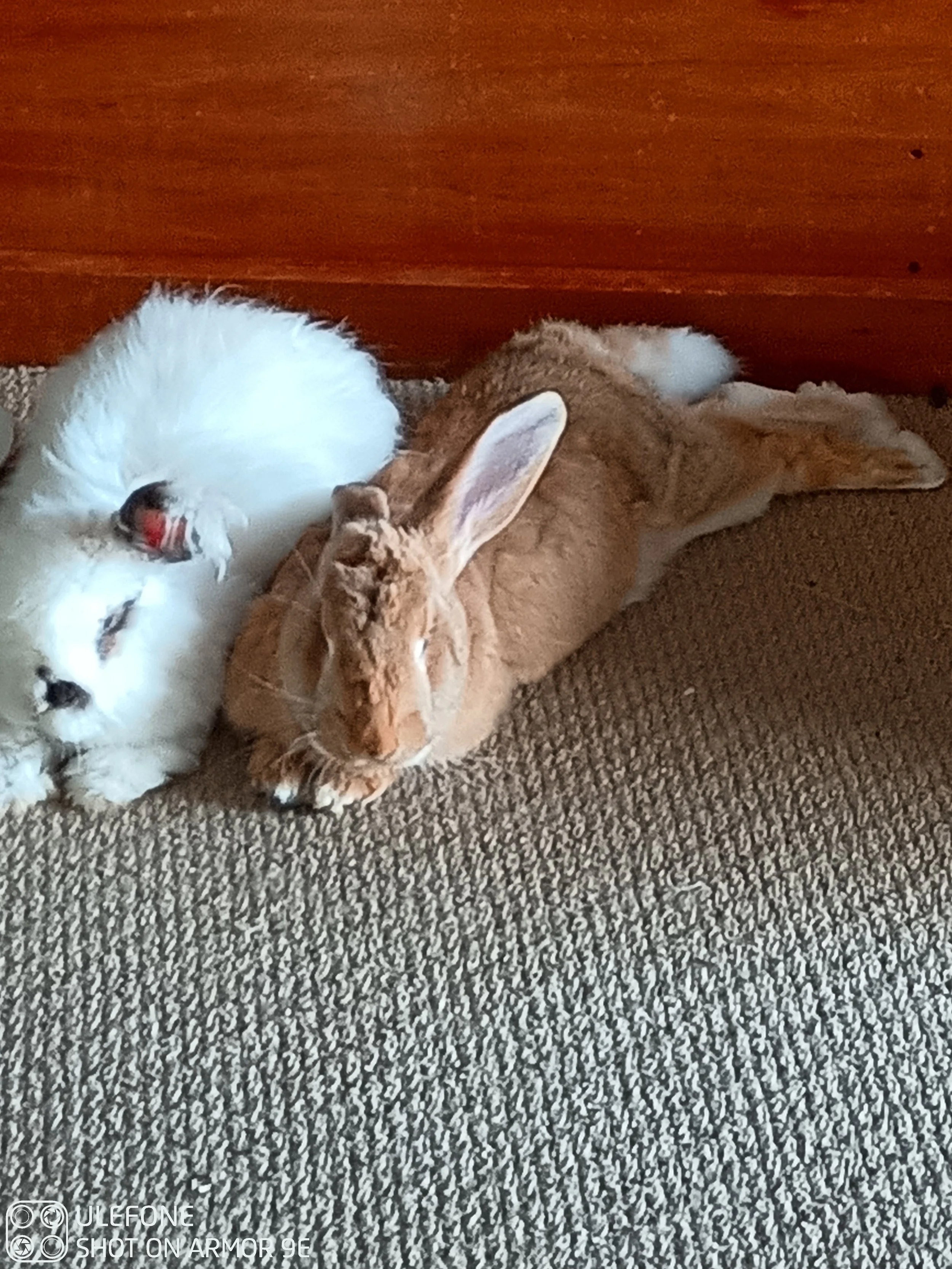 Chubs (Brown Flemish Giant) and Dorothy Fluffy (White Mini-Lop that’s more like a big Angora)