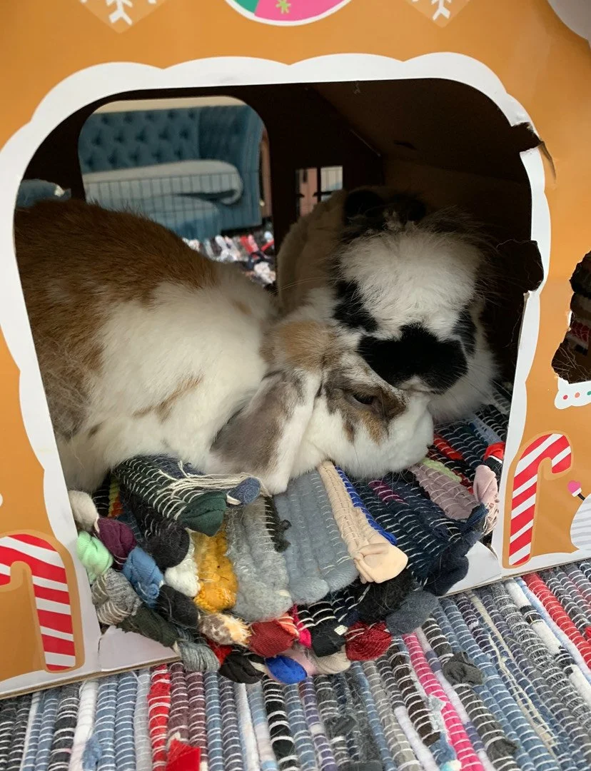 Will come with pet carrier (big enough for both of them), corner cage (always open and used as large litter area + hay feeder), puppy pads for the cage, litter trays with grills to keep their feet clean, refilling water bowl, 10kg bag of pellets, pellet bowls, leftover hay, Kmart cat boxes and scratchers, toys and treats, emergency medicines on hand for stasis, pet pen (currently sections off the back of the lounge for their large indoor area), nail clippers, brushes and scissors for Flopsy’s haircuts, and also a rug for their area if wanted.
