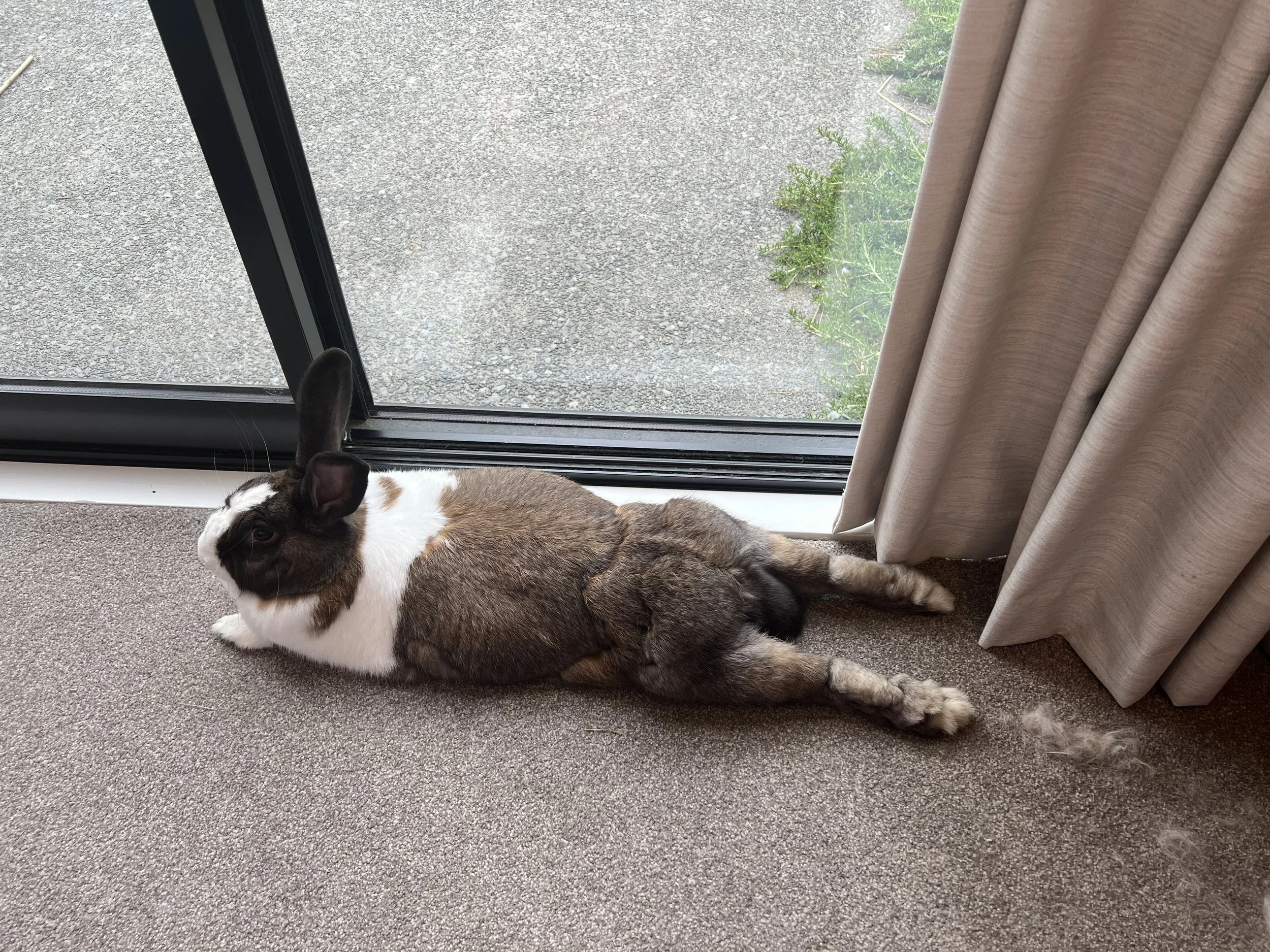 She had a husbun Bowie but he unfortunately passed about 9 months ago so it’s just been Jeff and I since then. We have bonded very well, she will come up to me and demand pats and will click her teeth constantly when patting her. She is a very cheeky and sassy girl, she definitely chooses when you pat her. She has a great personality, loves to flop and stretch out fully at home and do binkies and zoomies both inside and outside. She lives a very calm and peaceful life, a lot a sleeping and eating. Her favourite foods are silverbeat, pak Choy, broccoli and spinach. There aren’t many things she won’t eat. She of course loves carrots, bananas and apples. I also still give her lucerne hay which she loves and the mint biscuits that all bunnies seem addicted to.