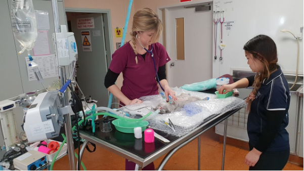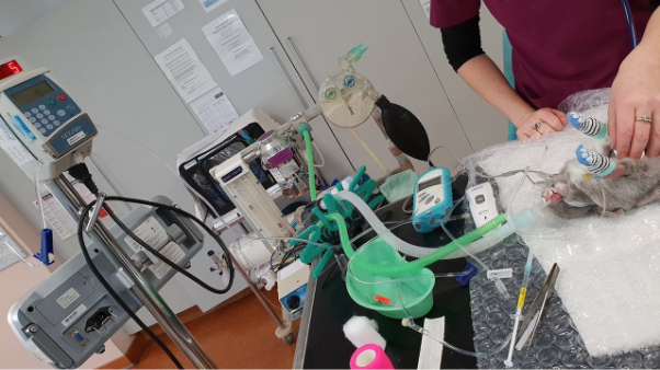 Here, she has been connected to the anaesthetic machine and is on IV fluids to support the body's fluid losses.