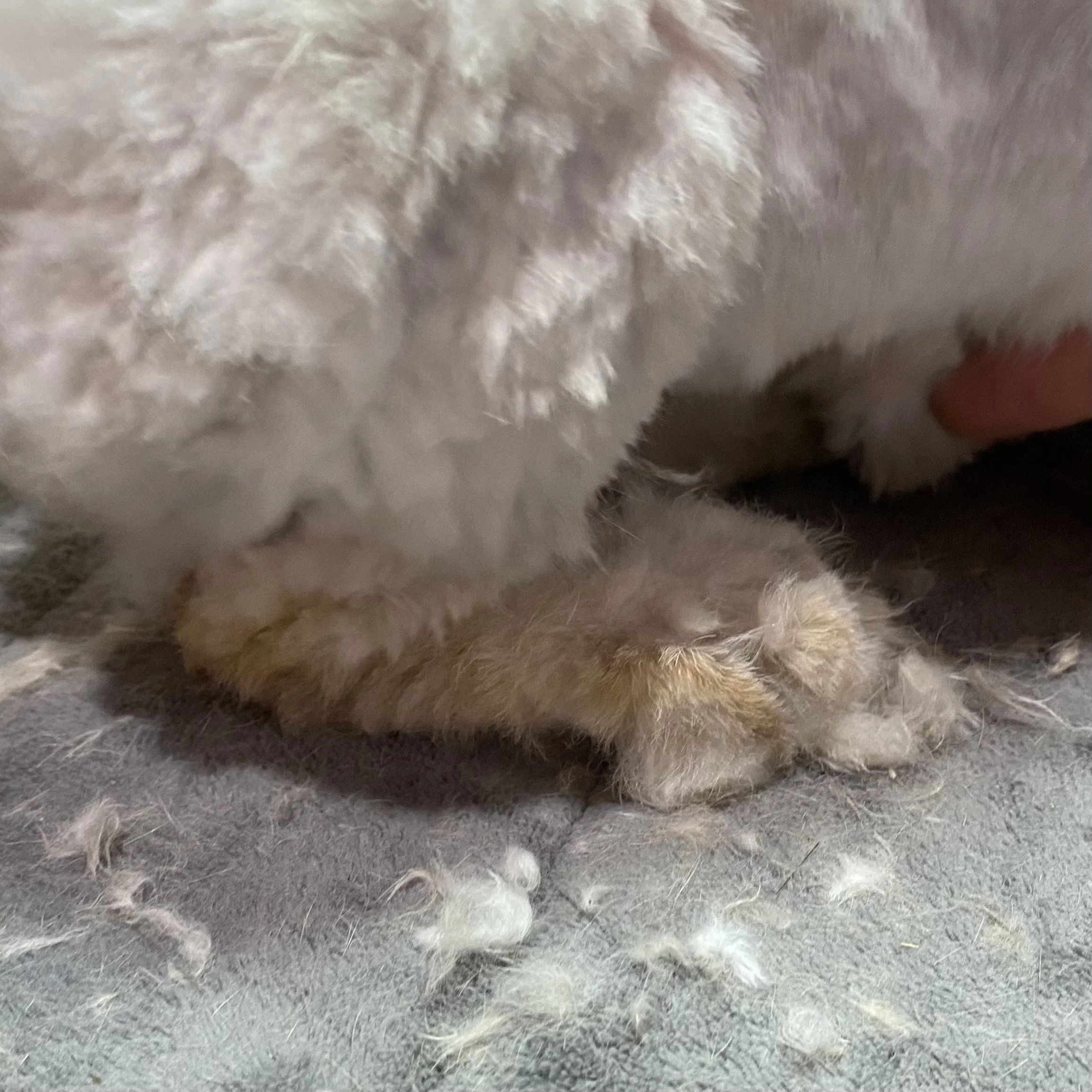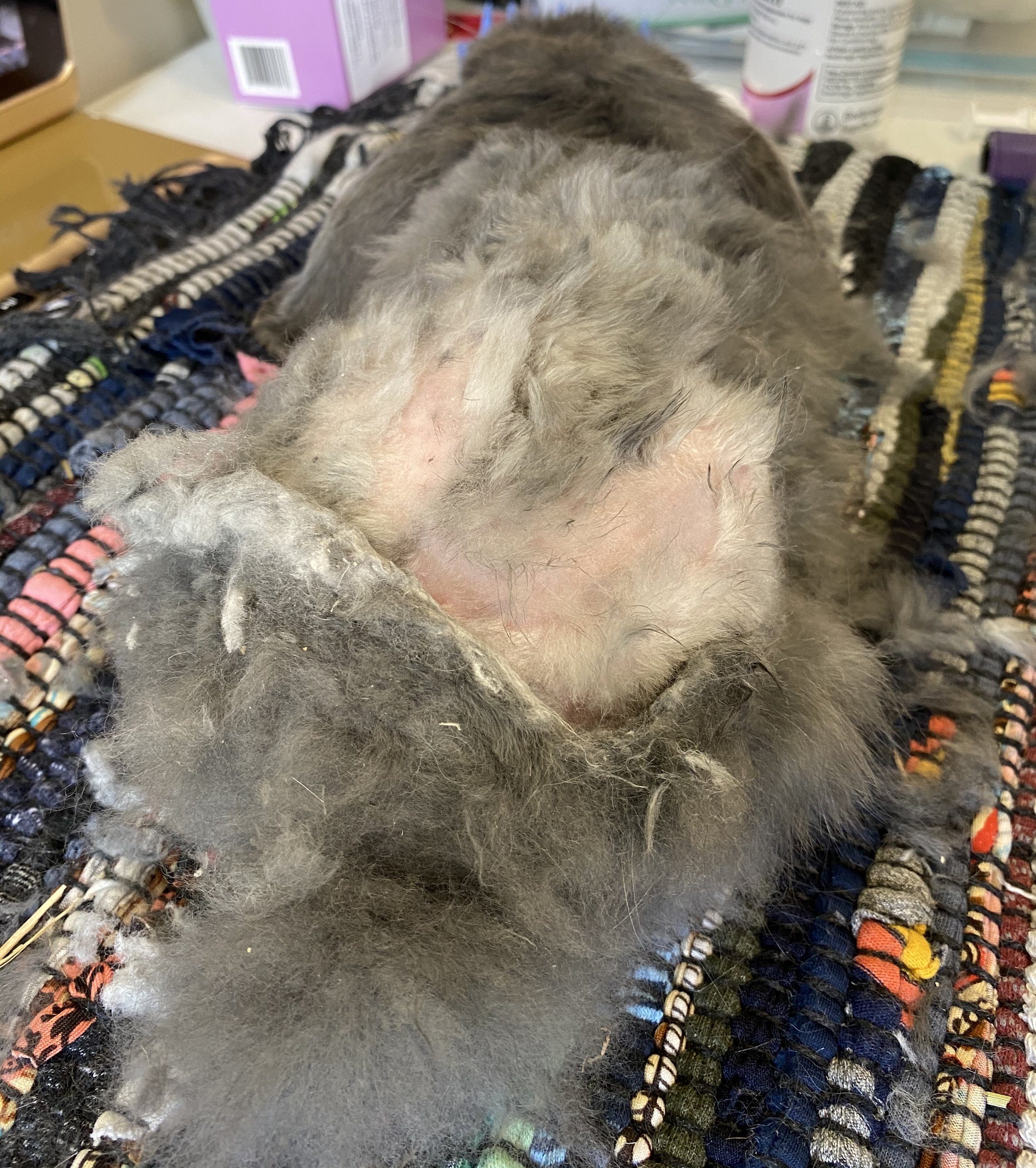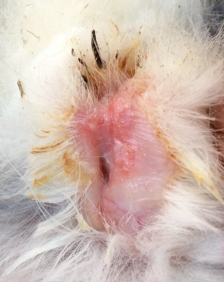 These photos show a bun in this situation. The bun’s back end - incl tail, lower belly/vent & feet, were matted and smelly. There was also a heavy fur mite infestation - look for the patches of white/yellowish ‘dandruff’ in the photos. The ‘close shave’ areas are where there was tight matting. The skin was inflamed and painful.