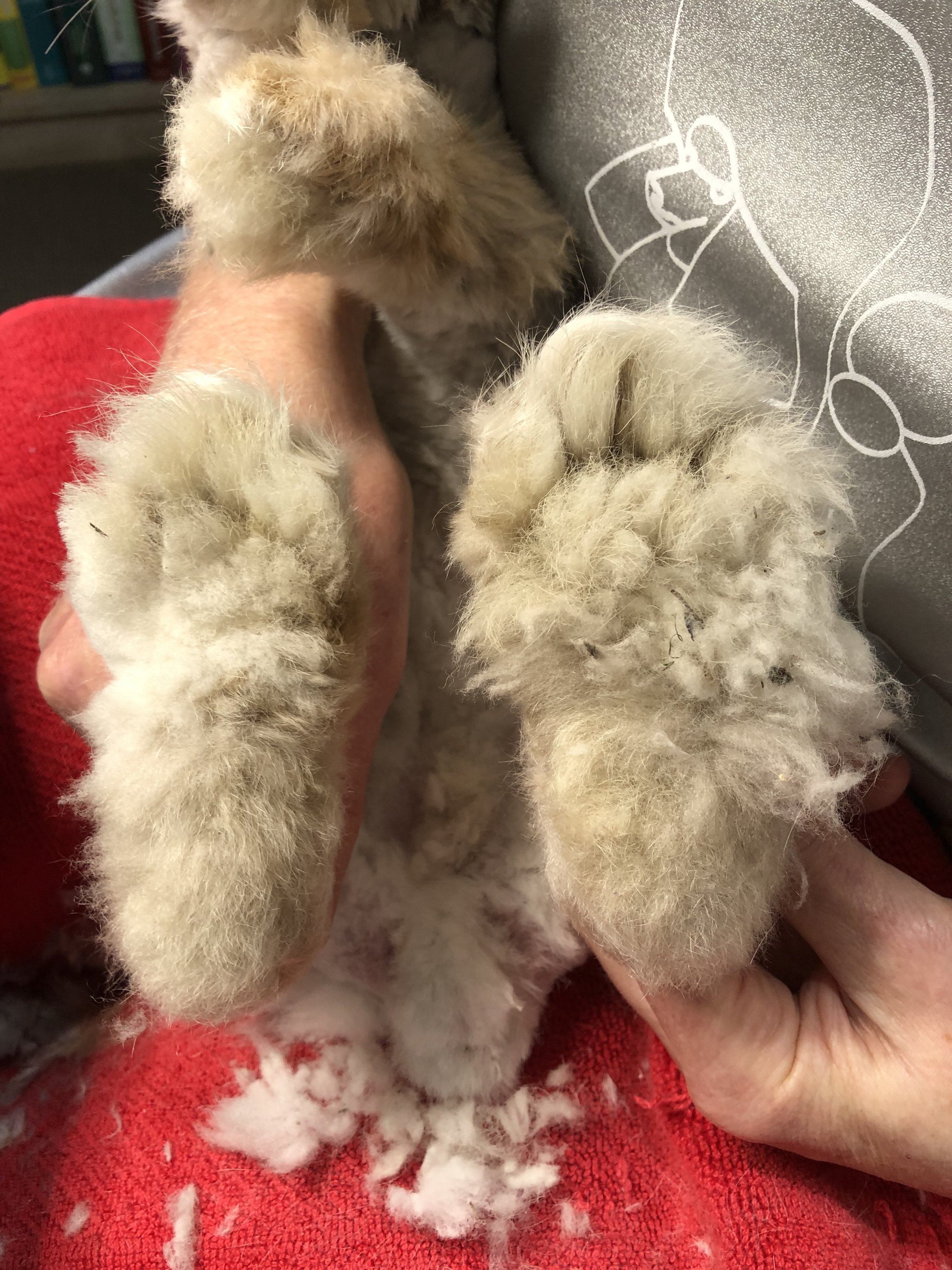 Never clip all of the fur off the bottom of a rabbit's feet. This leaves them with no protection and is incredibly painful for them. If the bottoms of the feet are matted follow the approach discussed in Matts section below.