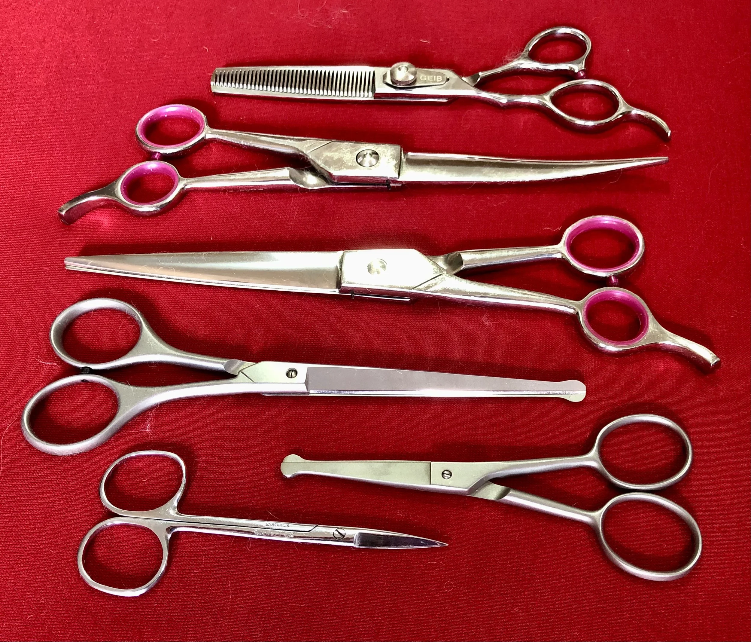 The scissors that I use frequently in conjunction with my clippers are; Witte Roseline Straight Safety Ball scissors (esp the 4.5”) and more recently I invested in a set of Geib Gator Left Handed Scissors; including a curved scissor. I also have a few pairs of very fine and sharp cuticle scissors.