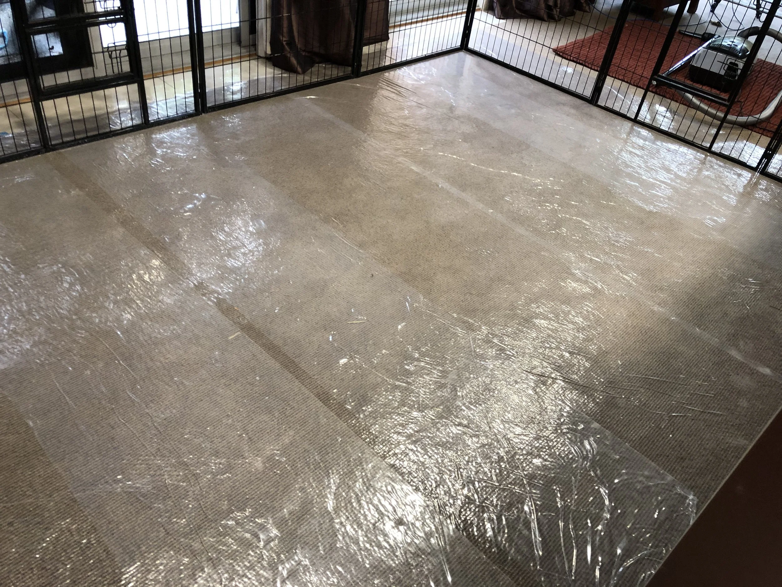 Here at Westley’s World I am testing Heavy duty Carpet Film to protect the carpet from pee. This film is available from numerous home decorating retailers. Mine came from Millen. I’ve tried many approaches and this is the best to date. It doesn’t creep, is easy to sweep and is tough enough to walk over. It would not stand up to a determined rabbit digging it, so I offer multiple layers of rugs and blankets for the buns to dig instead. I find using the really thick, heavy Jute mats as a base layer is great for this.