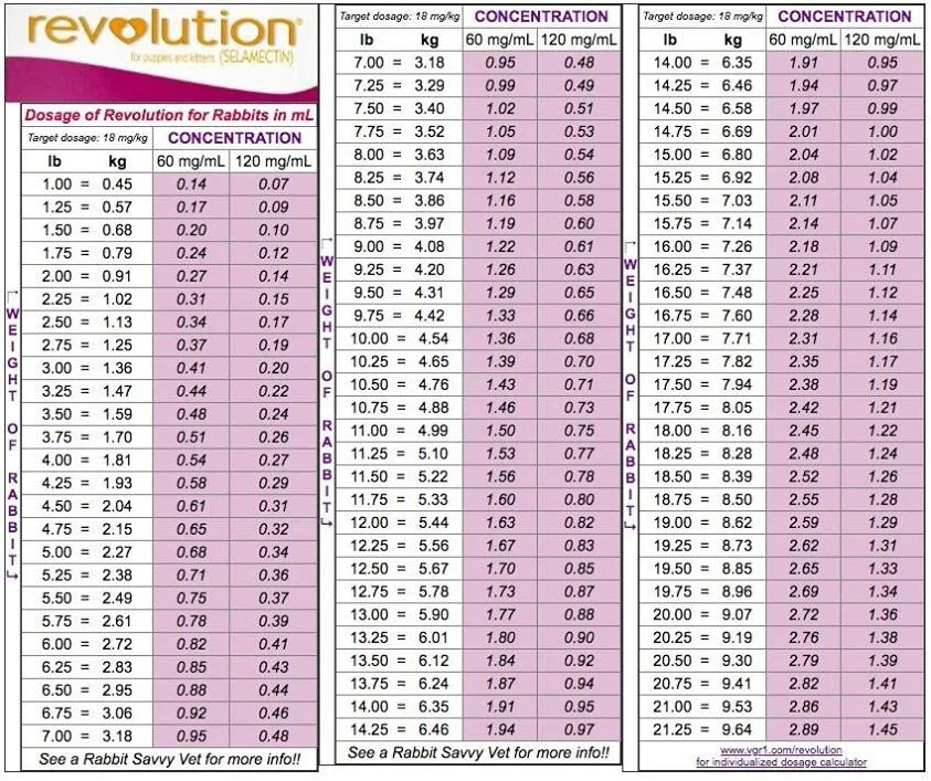 This equates to 0.3mls per kilo of rabbit weight of Cat Revolution (60mg/ml concentration)