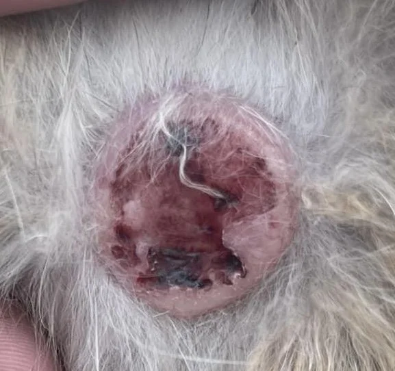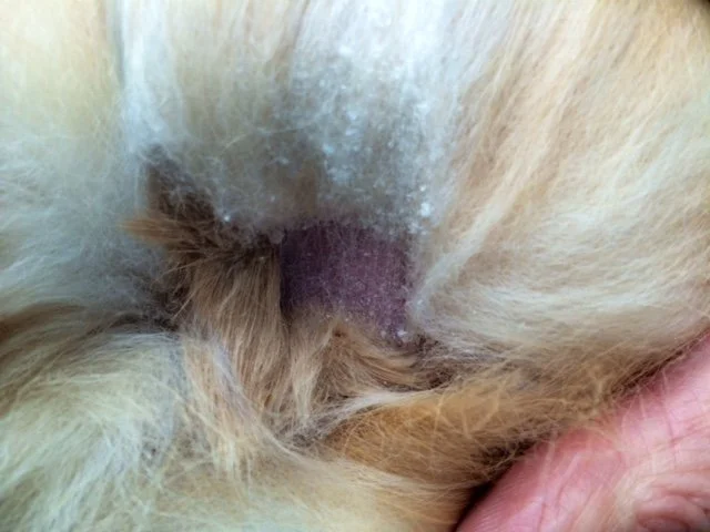Like saliva, urine is caustic. If it collects in the fur, it will burn the underlying skin, causing fur to fall out and the skin to become red and raw.