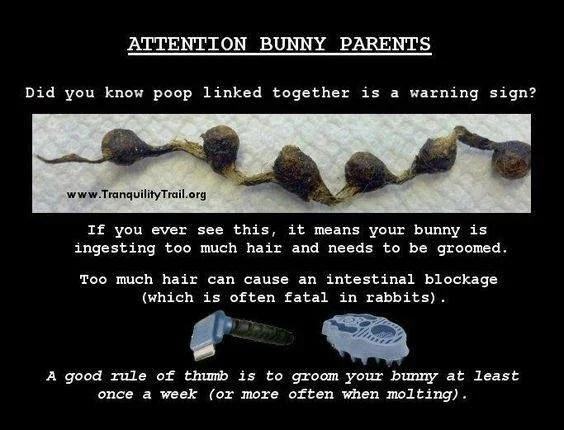 Grooming should be a regular part of your rabbit husbandry, but during moult this is absolutely essential to ensure your rabbit doesn't ingest more fur than its guts can safely process. If too much fur is ingested, this can lead to a blockage which is often fatal.