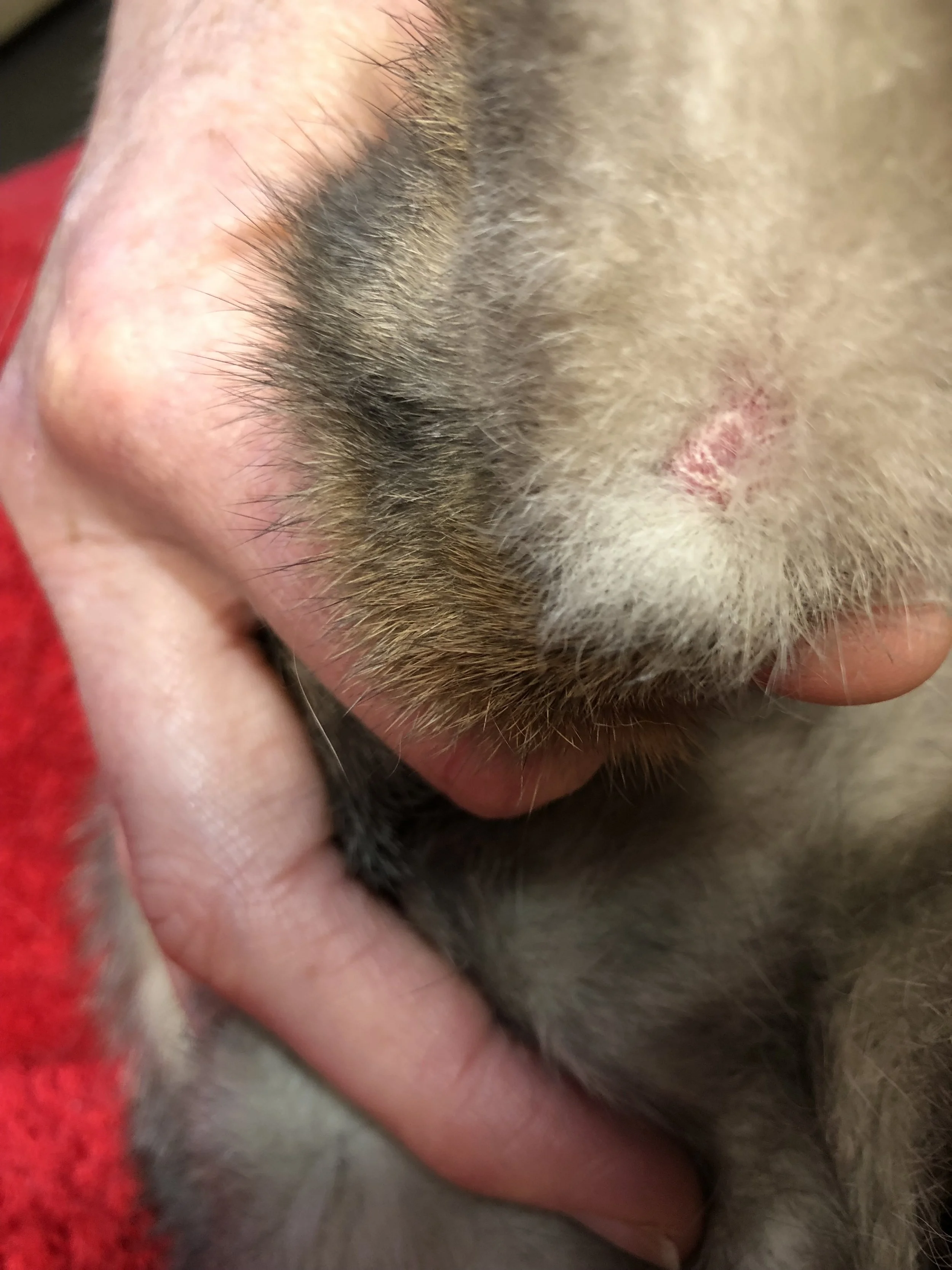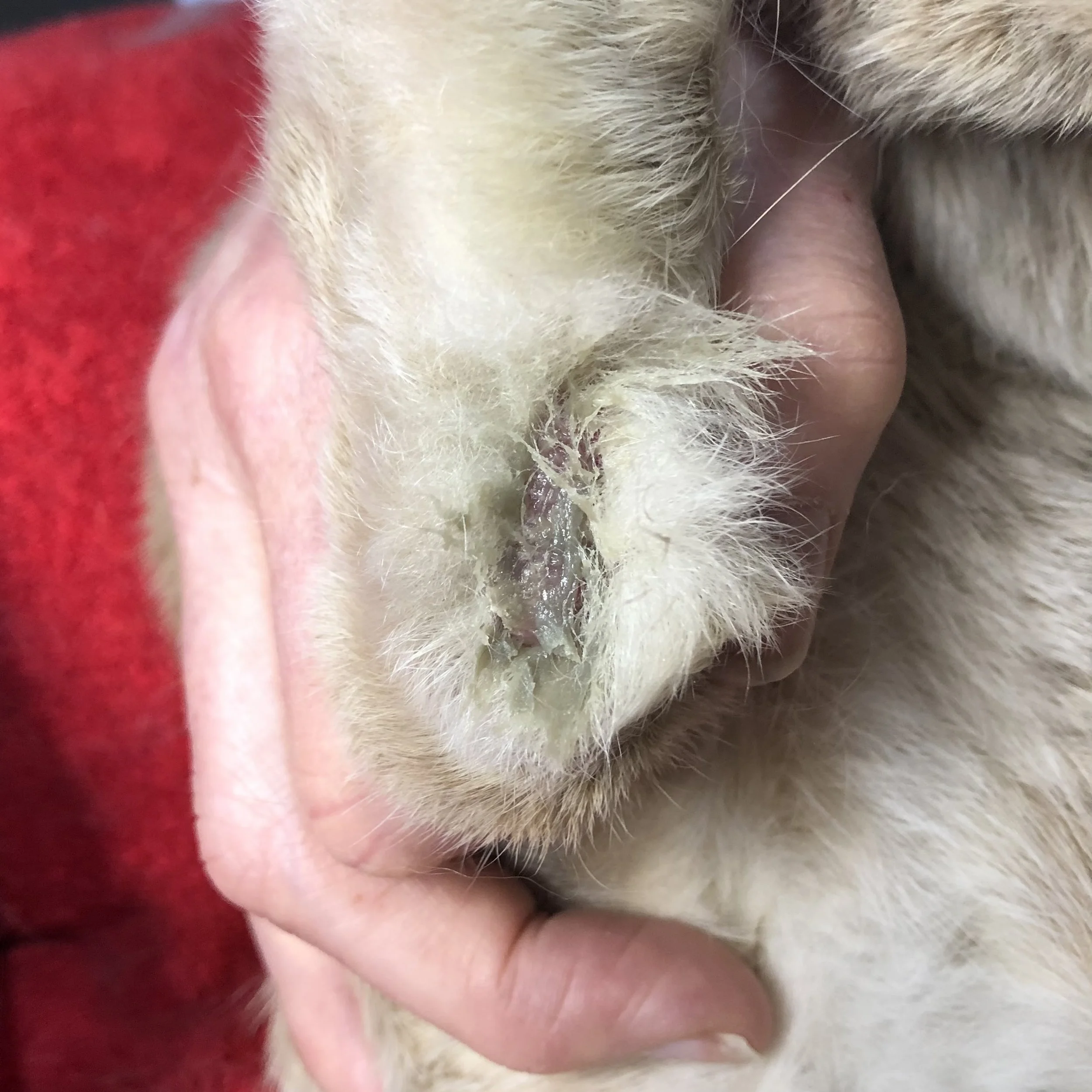 In the Beginning sore hocks often begin as a clear area of fur on the hock with hardened pink skin in the centre. At this stage, treatment is sometimes not yet necessary. Make changes to your rabbit's enclosure and bedding to make things more padded, and keep an eye on the hock for any signs of worsening. In addition to changing the flooring, application of WW’s Bunny Balms and/or Liquid Bandage may help prevent the problem getting worse at this stage.