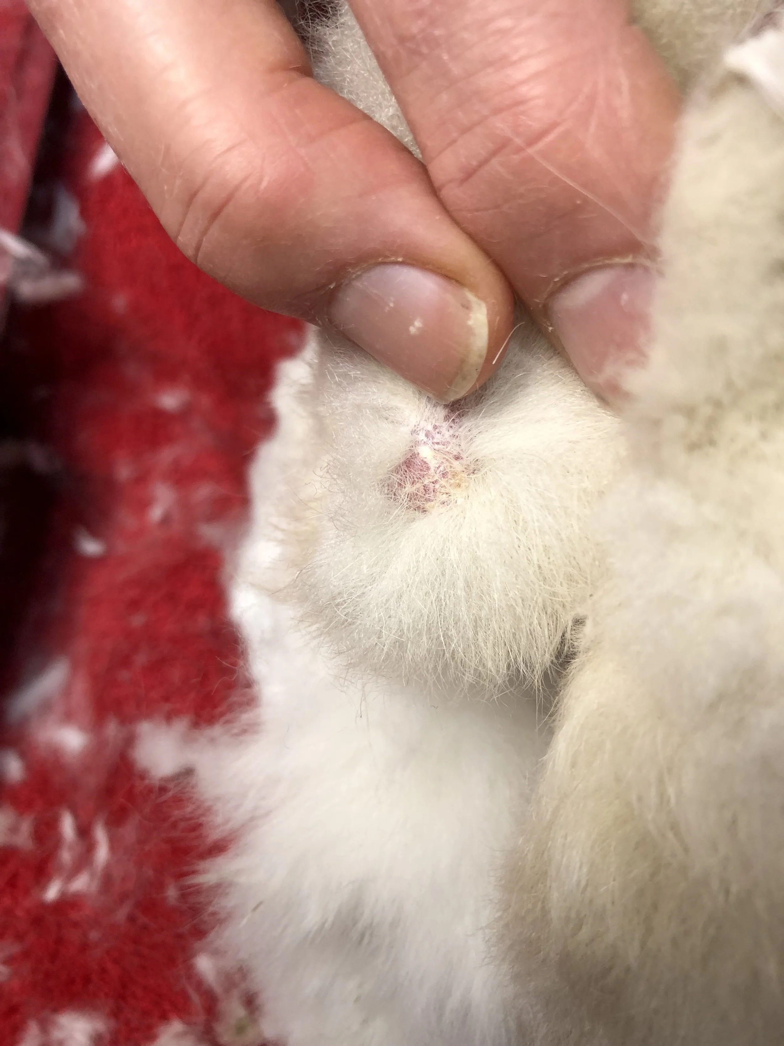 If advanced, lesions can develop especially if the rabbit lives on hard flat surfaces (such as wooden floors). Rex rabbits are also predisposed due to their short fur and lack of guard hairs. One recent study in the UK showed that it is also more common in older rabbits, in females, and most indoor rabbits will have at least the little pink spot.