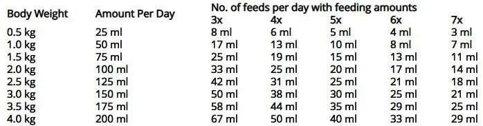 Feed up to 10ml per kg body weight of the mixture, four times a day, though it’s important to be guided by your on pet as some won’t tolerate as much as this and should need to be offered smaller quantities more frequently. Always use fresh mix at each feeding.