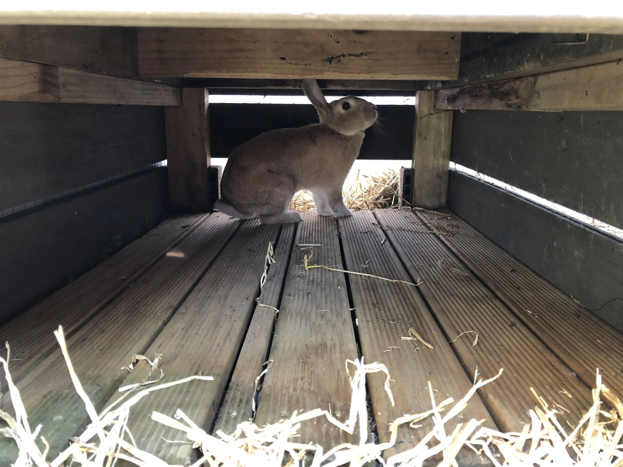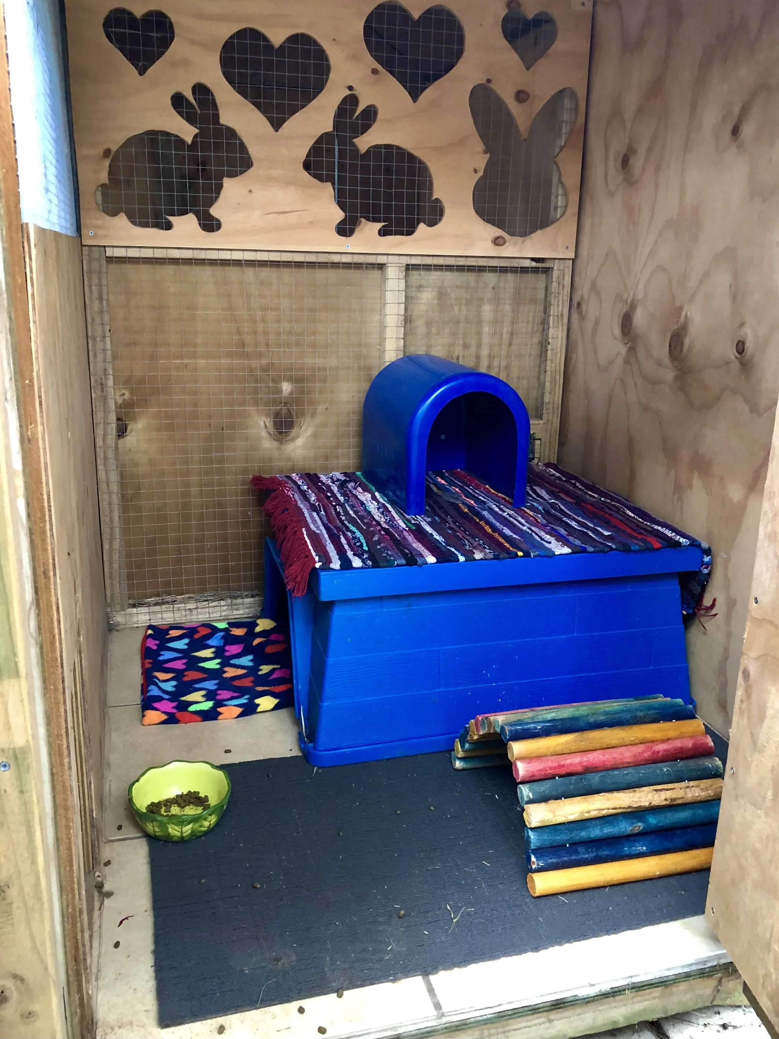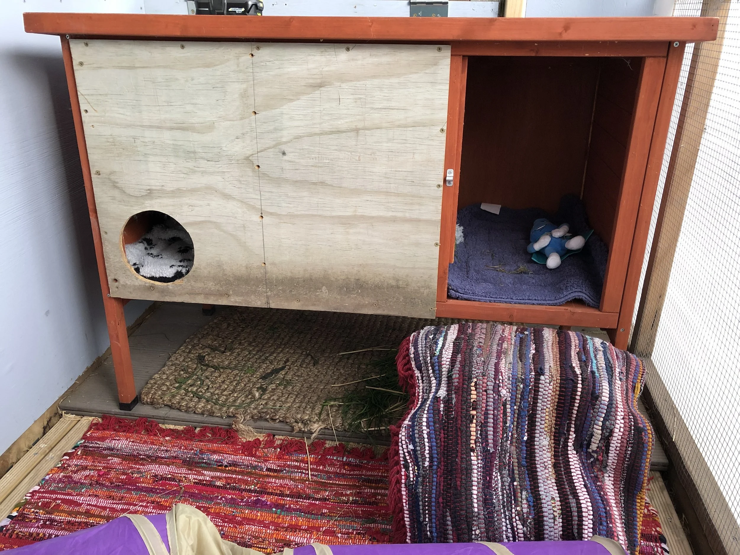 The first alterations that were done was to remove the internal divider, remove the door and replacing the mesh front with a piece of ply with a 2nd door hole cut in it. Although ‘ugly’ this approach proved to be really popular with the rabbits in the rescue. Once I decided to move this hutch to the Cabuna as an enrichment element I further upgraded it significantly.