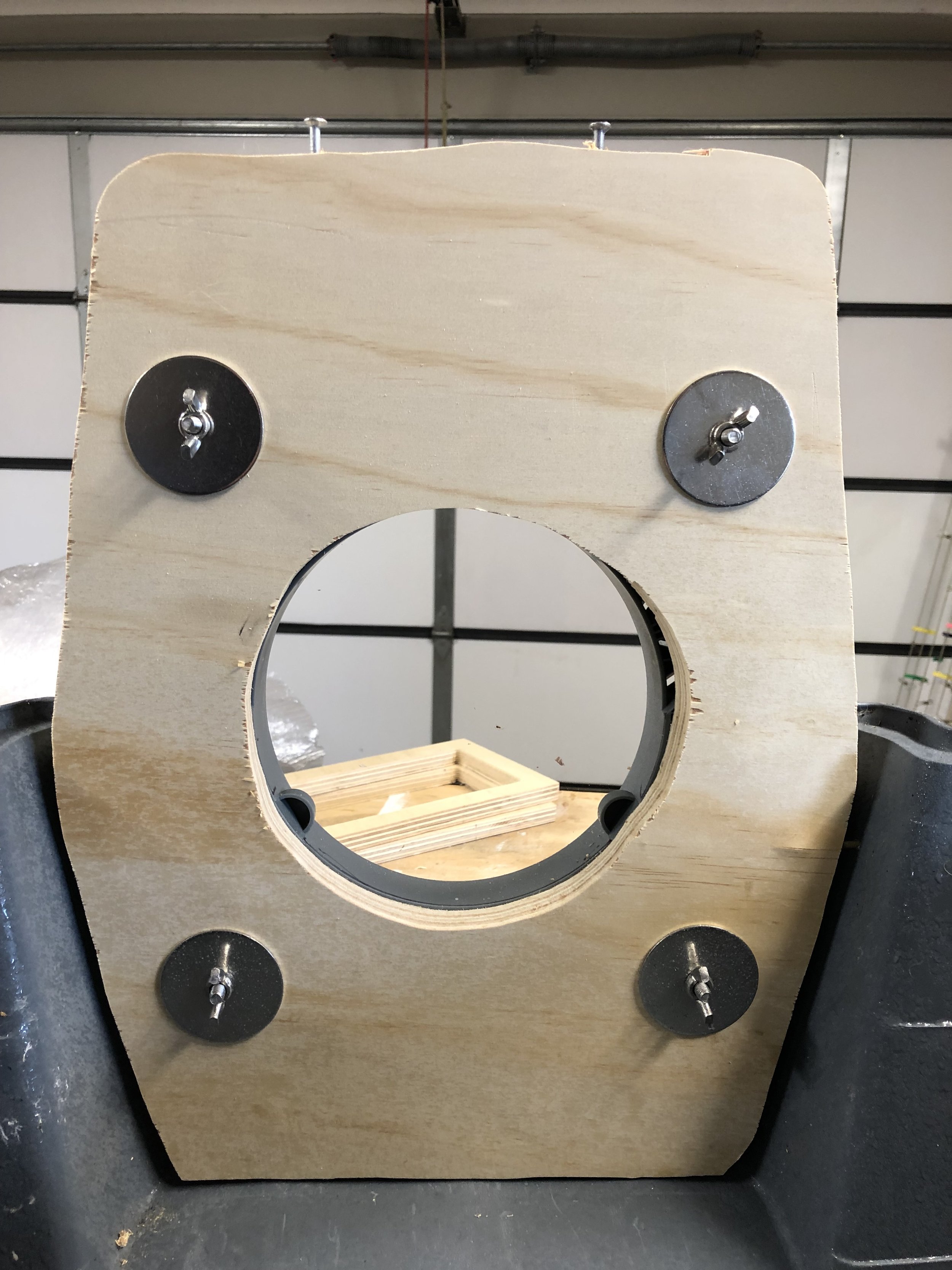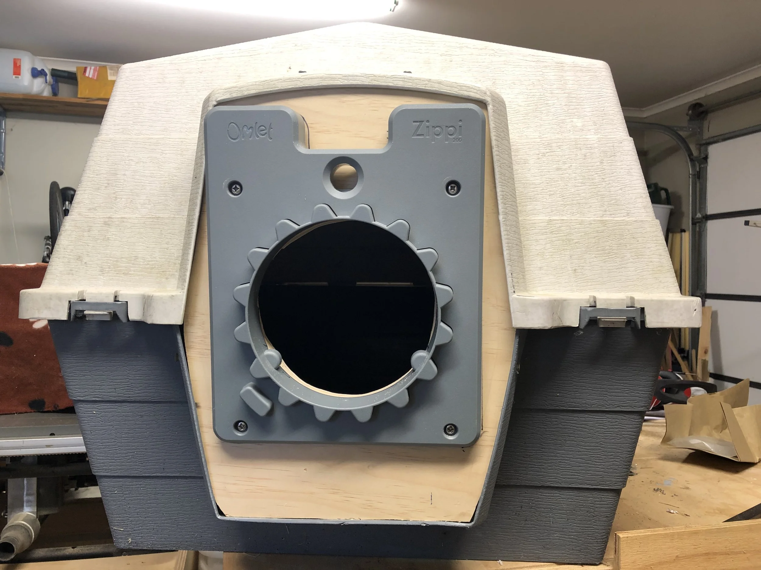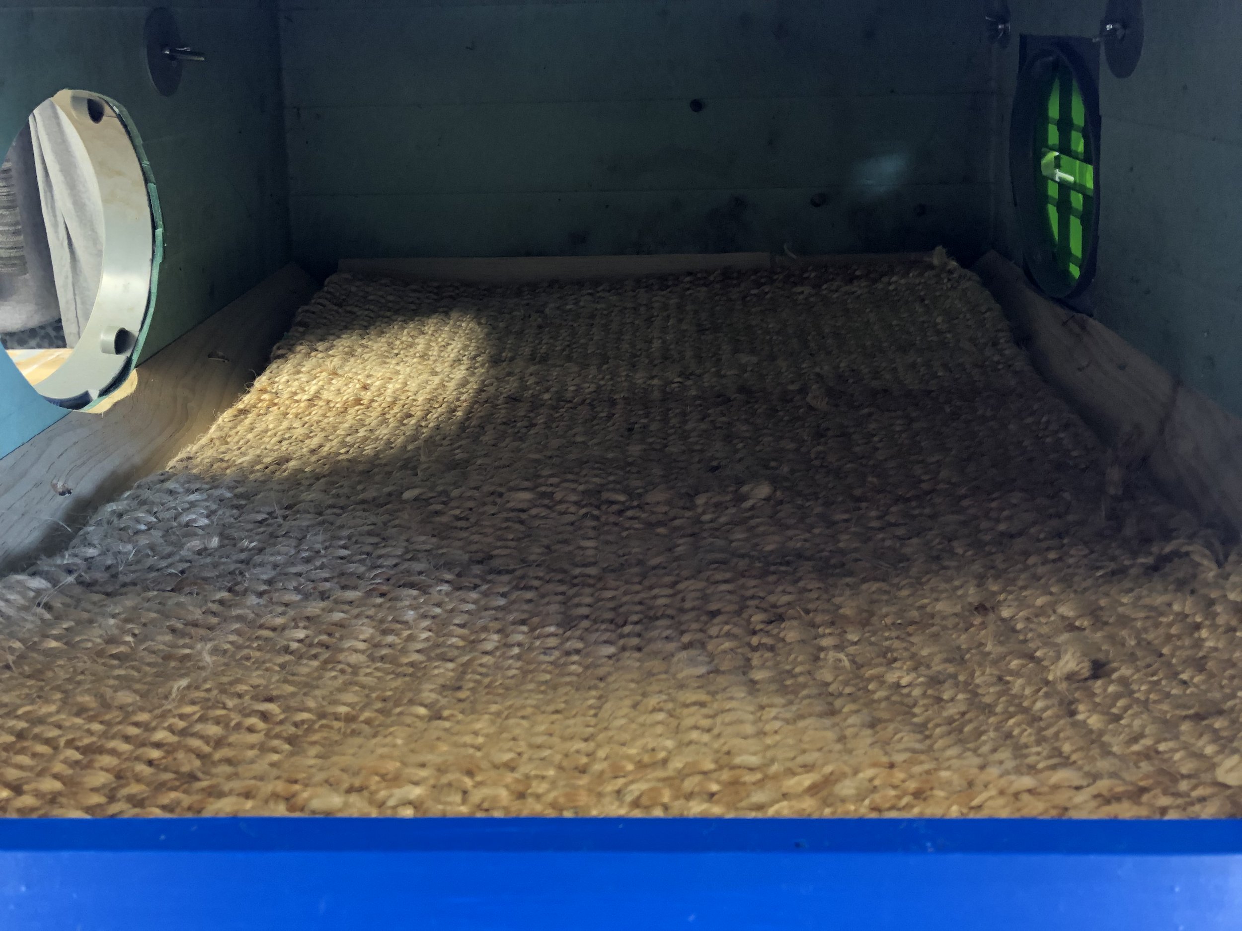 Next I decided to repurpose it as a 1/2 way station between Lola and Roux’s Zippi pen and the patio. To make this work I added a ply floor and made a hinged ply door in the original doorway. Next I added two Zippi Tunnel mounting plates. I placed a jute mat inside the box to soften the ply floor.