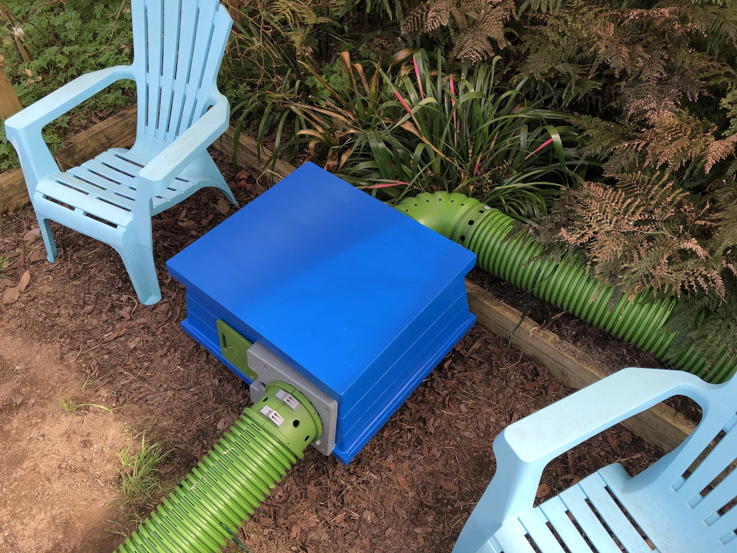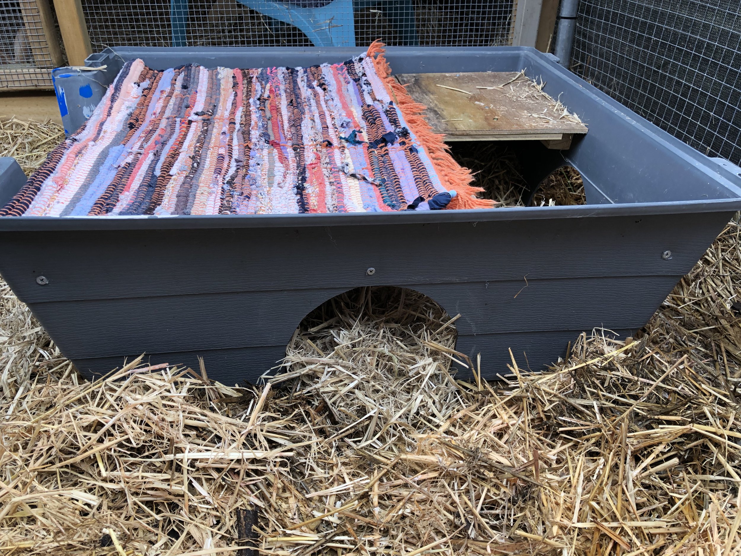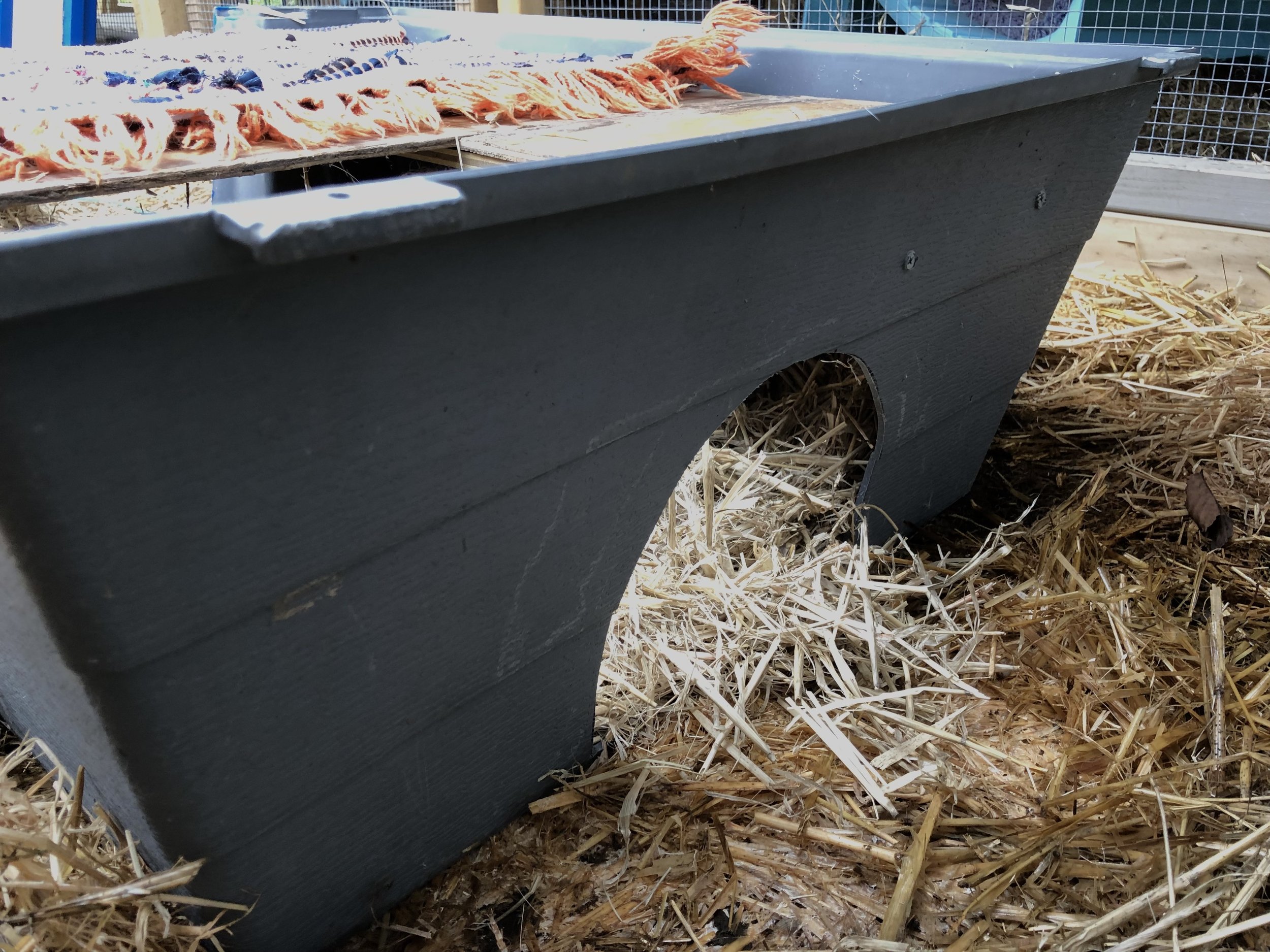 The Blue Boxes latest use is under cover inside the Cabuna for Chuchu and Jasper. The hinged ply door has been removed and one tunnel has been added, with more to follow.