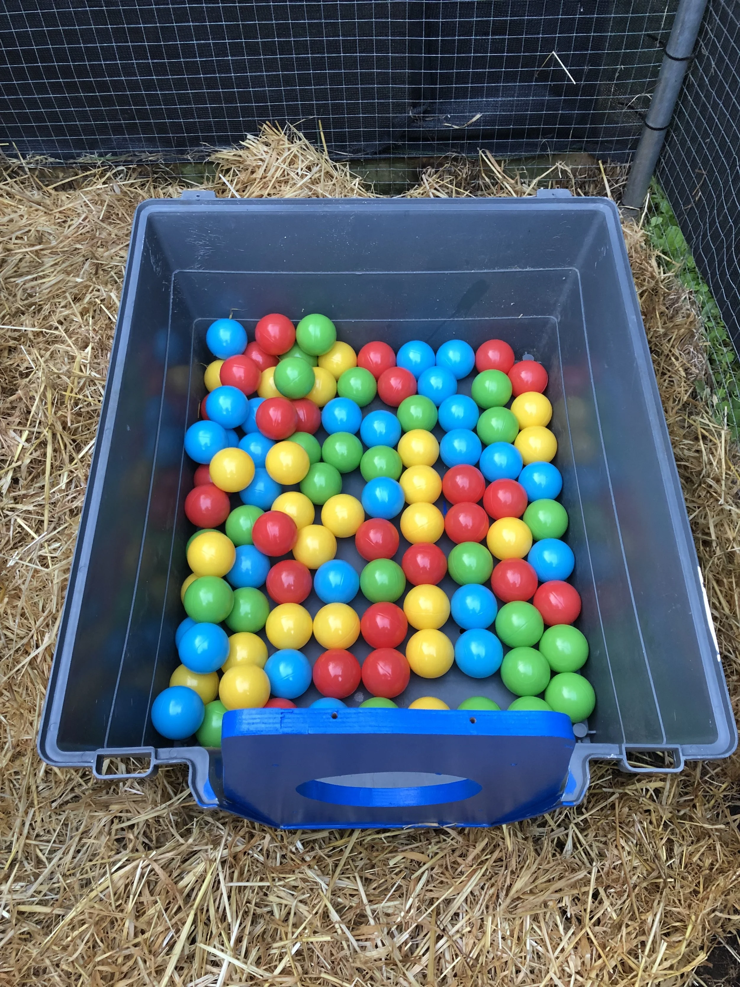 The next use was as a ball/digging pit in the Cabuna. Fo this I first removed the tunnel mounting plate, then I painted the top using the same approach as above. I filled the base with plastic ball pit balls and waited to see what the buns thought … which as it turns out, wasn’t much so I went back to the drawing board!