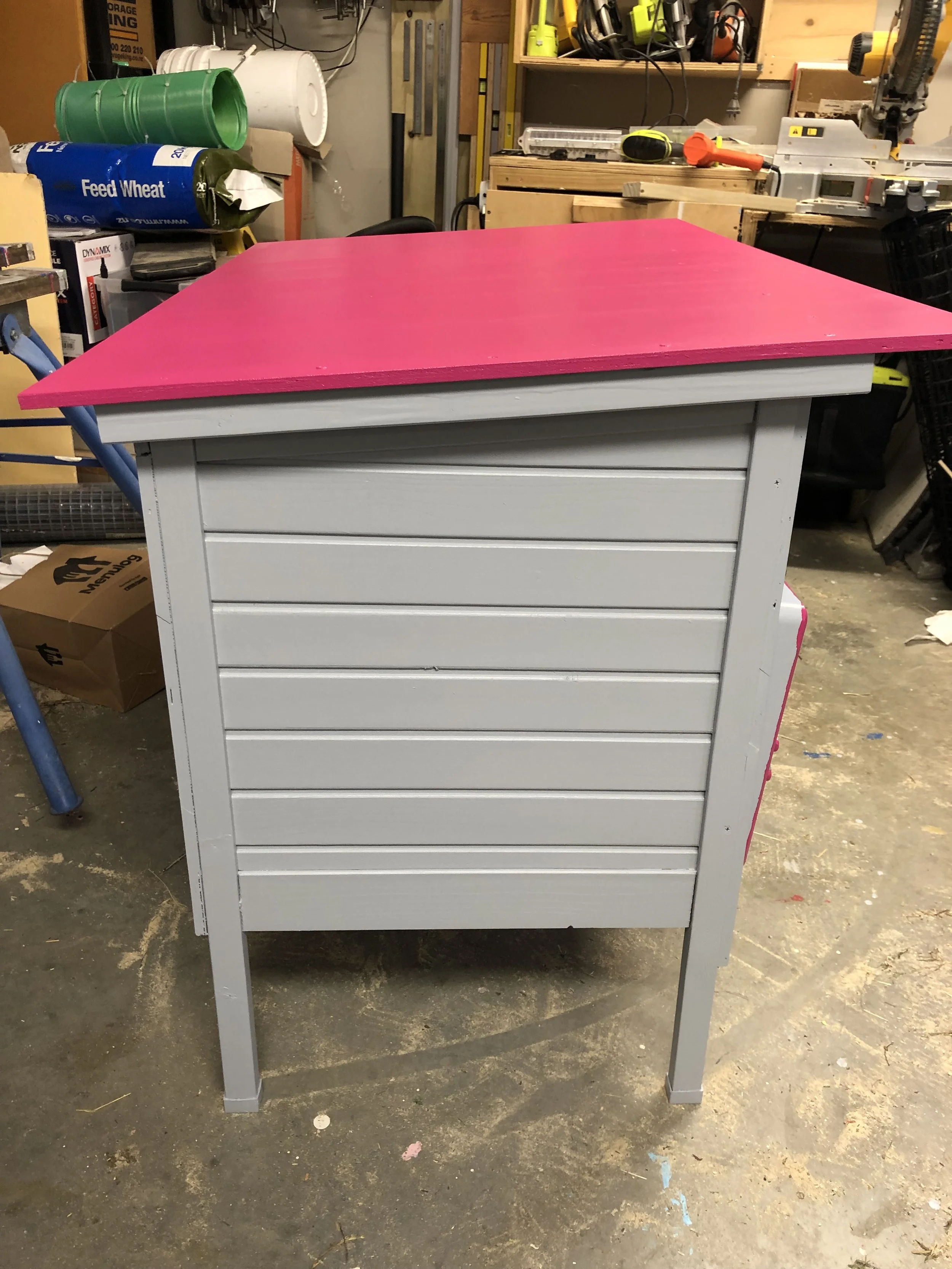 I framed up the top using the timber, making a hole in one corner that would be the ‘escape hatch’ from upstairs to downstairs. The framing was then covered with the decking. Next I added legs and simply cut the decking to fit, screwing it on to the legs and the framing of the top. The base has a higher opening at the front and a ‘bolt hole’ smaller opening at the back.