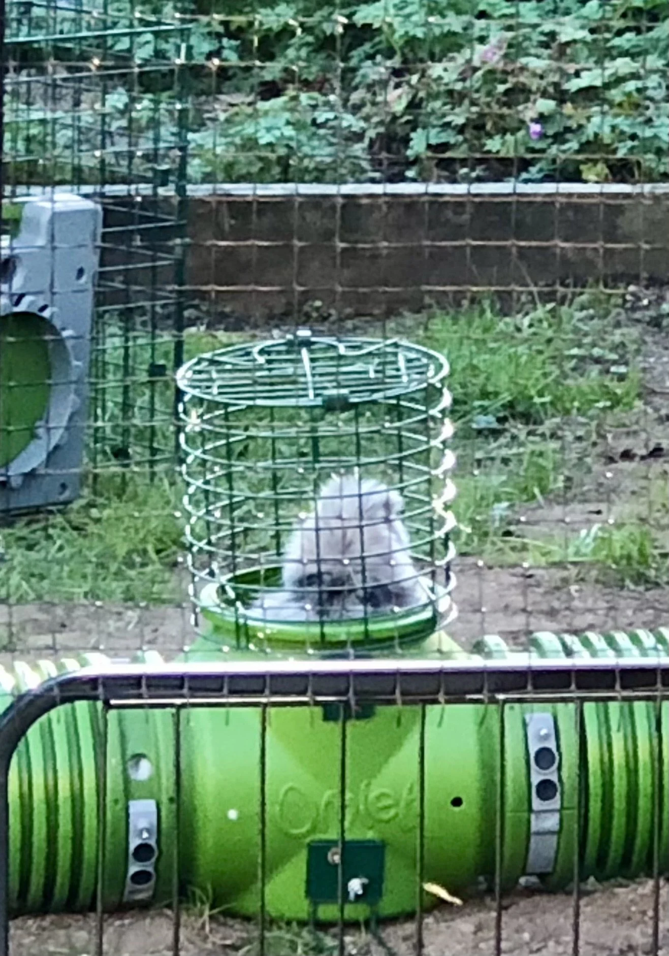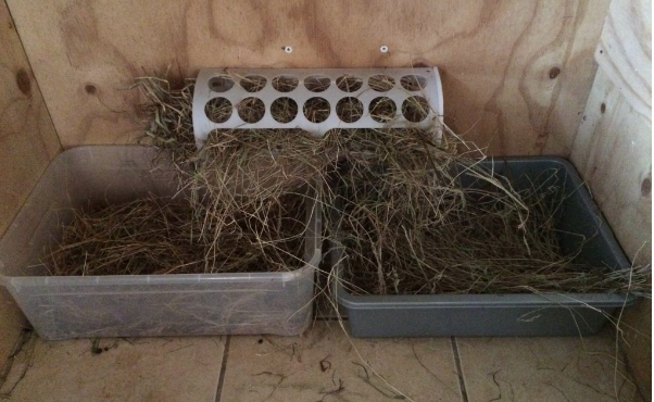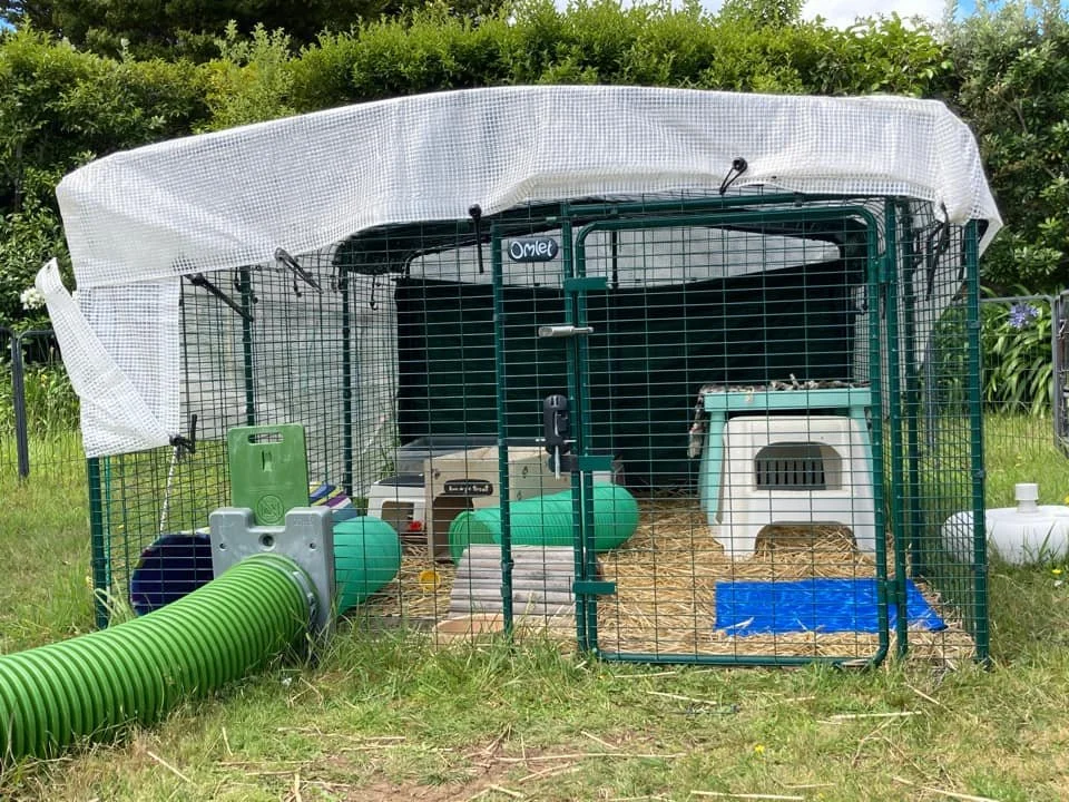 This ‘standard’ hutch was donated to me in poor condition. The internal divider was removed and it has has a new floor, front and back. In addition, a sheet of ply has been screwed to the roof to extend it and improve insulation. The Zippi tunnel and its connector are from Appletons.