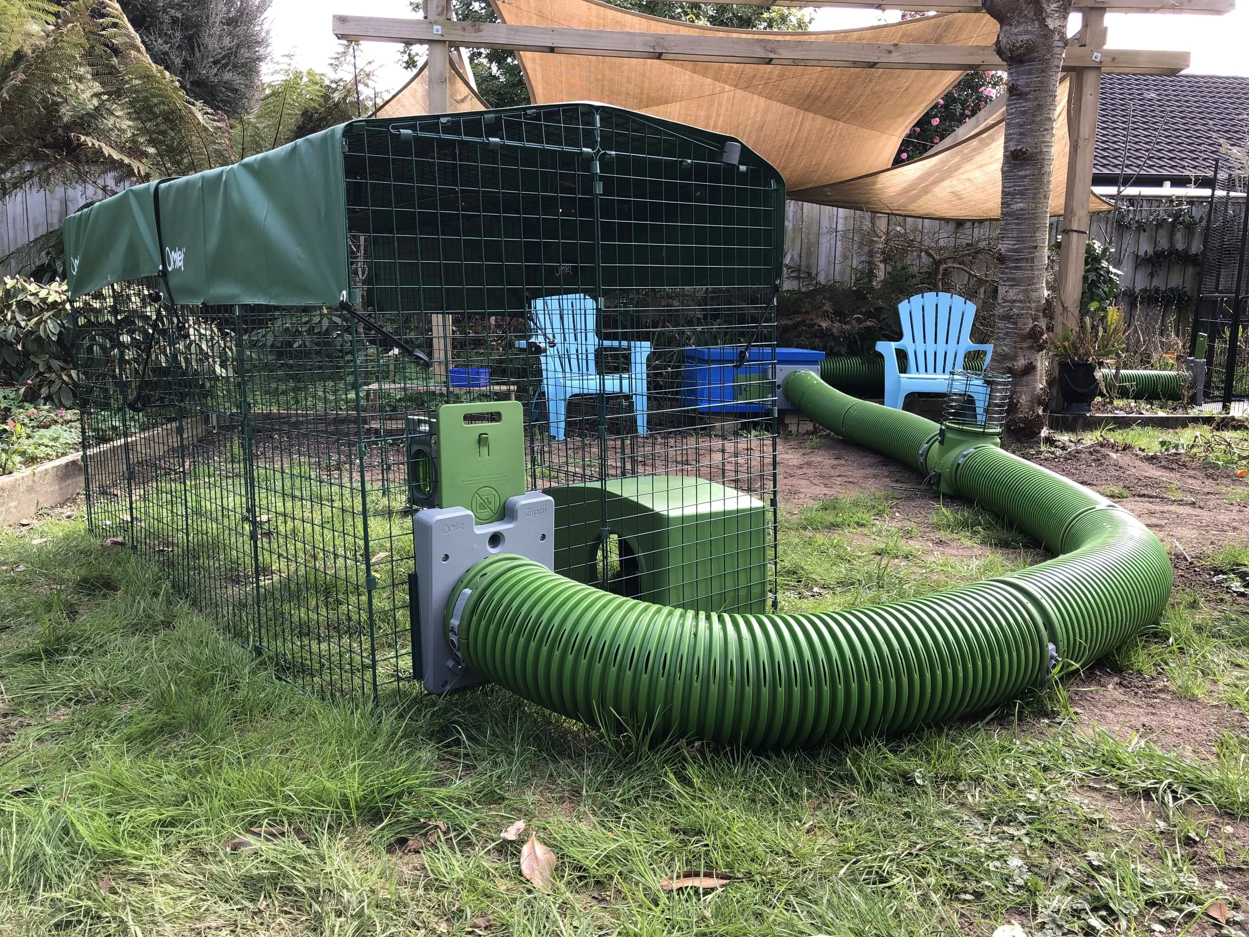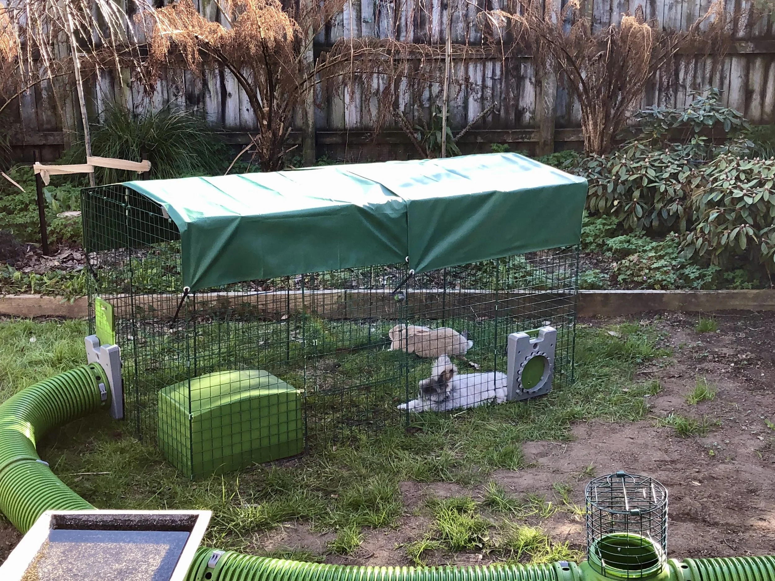 Appletons sell the Zippi tunnel and pen system, below. These are really strong and secure. Use for joining outdoor housing and runs together. The tunnels may not be big enough for very large rabbits. I’ve seen a 5.5kg Flemish fit through them with no issues.